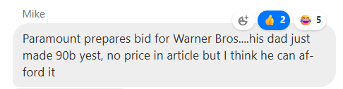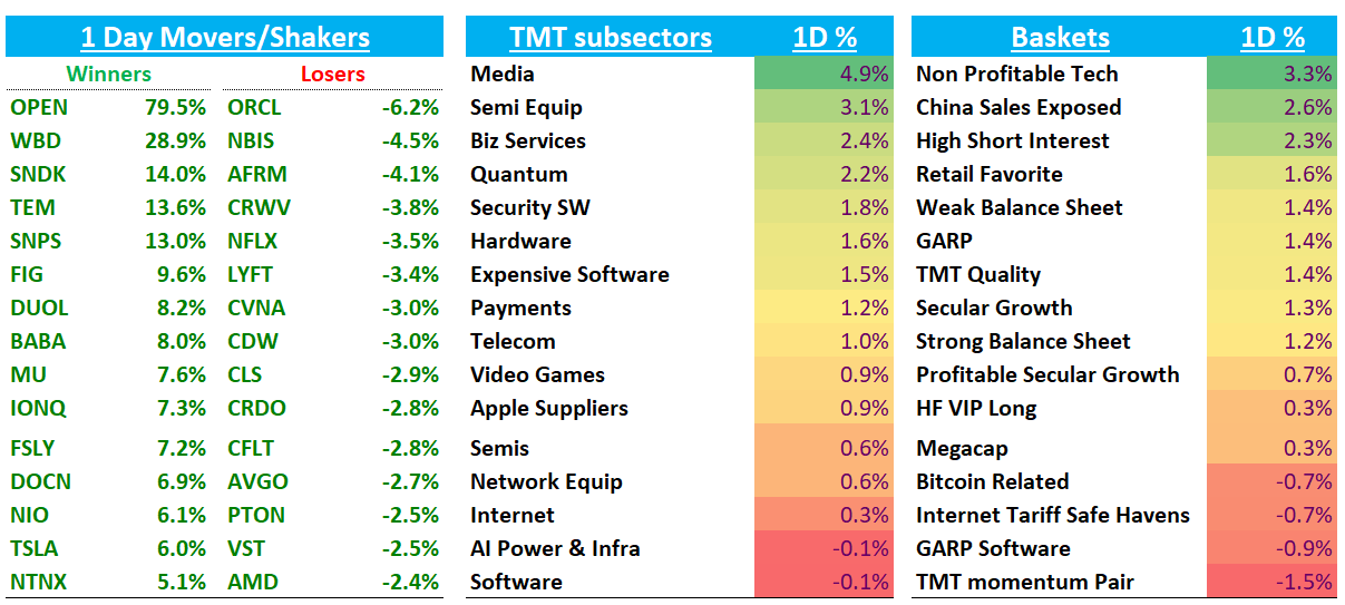 NFLX -3.5% was weak all day on the rumors (then confirmed by WSJ) that Paramount Skydance preparing a bid for WBD. Wells Fargo was out speculating NFLX could maybe pay up for the asset, which helped ding the stock. Having Max and Paramount under one roof would consolidate the two sub scale streamers into a credible No. 2 by library breadth - WBD is at 126M subs vs Paramount at 78M for a total of 200M+ vs NFLX at 300M — the glass half full argument is a consolidated studio could pull back or re-price licensing to NFLX raising NFLX’s content costs and also compete more strongly for ad dollars.
