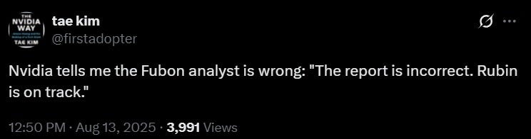 #1: We’re probably at peak good news today (Rubin delay + a 100k TSM CoWoS #). Unlikely we get any datapoints in the near-term that take the buyside numbers higher.