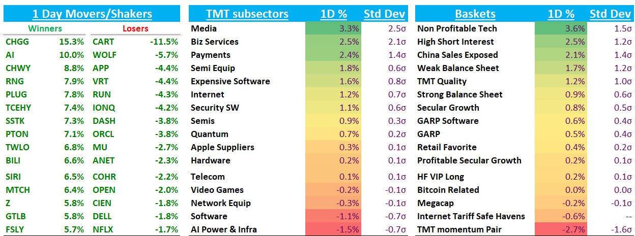 AMZN +1.4% as they announced they are expanding Same-Day Delivery to include perishable groceries in 1K+ U.S. cities, allowing Prime members to order fresh produce, dairy, meats, and frozen meals alongside non-perishables, with free delivery on orders over $25. Sell-side was generally positive on the announcement. Read-through here for DASH -4% WMT -2.5% and CART -12% was negative as means more competition….On AMZN, get the sense investors v focused on AWS data right now looking for any hint of uptick (we’ve already heard of checks calling out slightly better capacity in July) - we’ll see what we hear over the next few weeks.