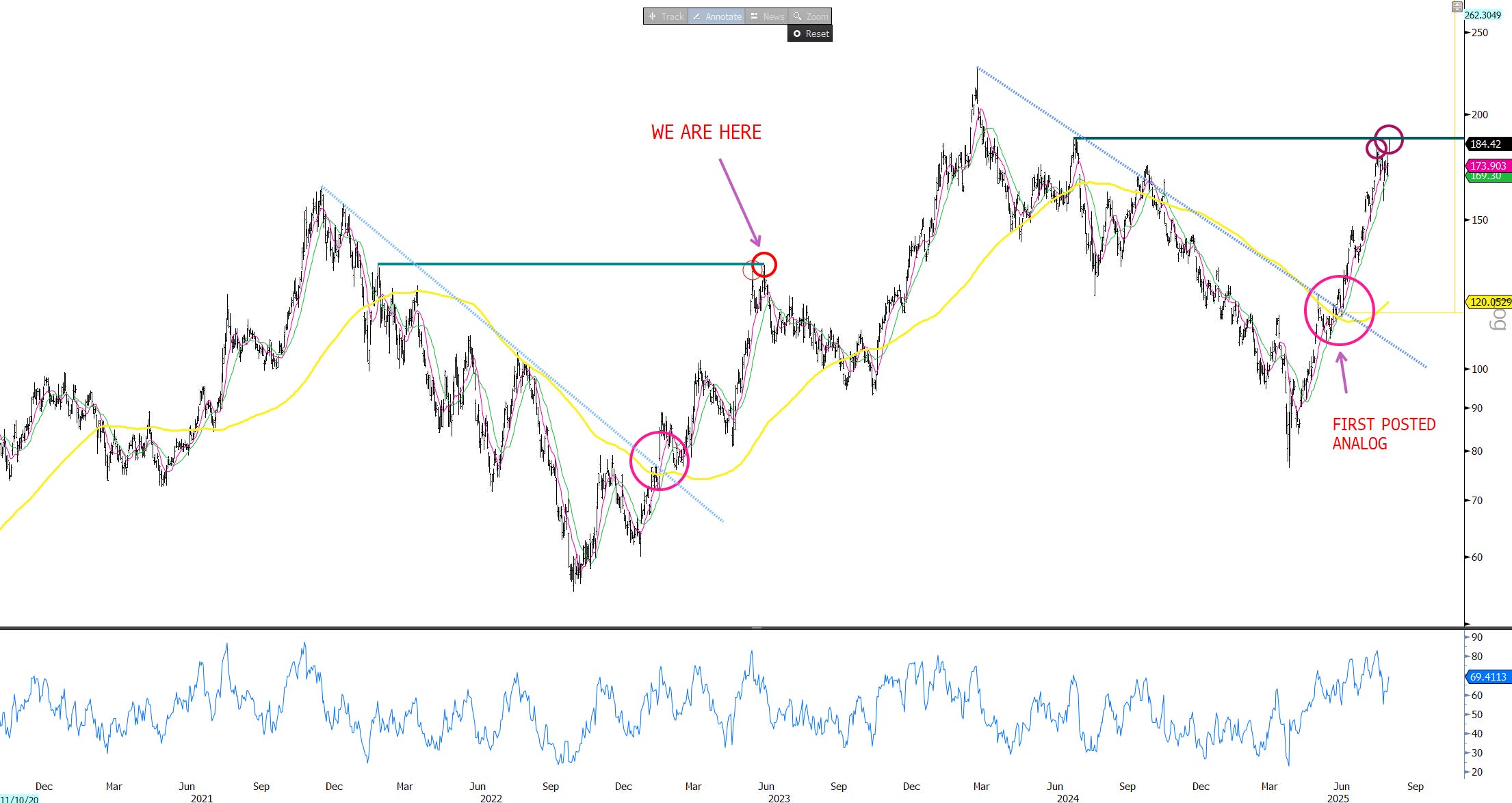 #2 We’ve been following this analog closely with AMD and it would point to some further near-term digestion. We first posted this analog in TMTB chat here in Mid May under $120 in June, which gave us confidence in initiating an AMD long. It has continued to work since then: