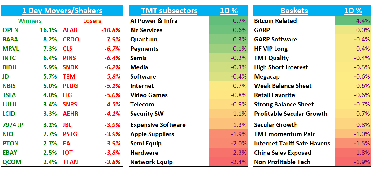 AMZN -23bps despite Wells Fargo jumping on the ‘26 AWS acceleration boat given Project Rainer ramps, saying it could add 5-7% to growth in ‘26/’27 - this view largely consensus at this point, but still lots of debate around when we begin to see it in the numbers.