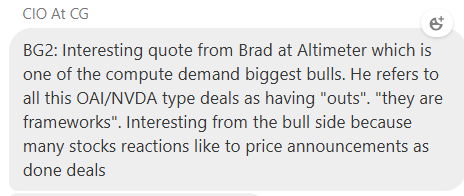 CRWV +4% as Coreweave announced a major partnership with Poolside, supplying over 40k NVDA GB300 NVL72 GPUs for the AI model developer. CRWV will also act as the anchor tenant for 250MW (up to 750MW) of Poolside’s 2GW Project Horizon in West Texas (the 40k consumers about 100MW). Financial terms weren’t disclosed, but saw that ISI thinks it could add about ~$5B to RPO/backlog based on $3 per GPU hour pricing over 5 years. ISI thinks this and other wins could push backlog above $55B, although this deal closed after Q3.