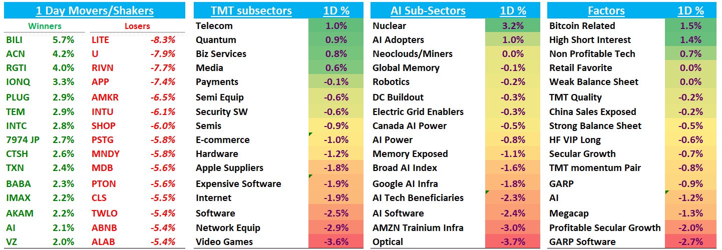 Not any great broader narratives in the Tech tape today as it seemed like broad risk off price action — to us it just felt like some digestion in many consensus names after a strong YTD start — with pressure concentrated in software, internet, video games, and AI-linked subsectors, while defensives and select cyclicals outperformed. AI software, optical, and AMZN Trainium-related infrastructure were among the weakest AI buckets and YTD winners like semi equip were down as well. On the factor side, megacap, GARP, and profitable secular growth underperformed, while high short interest and bitcoin-related names outperformed.