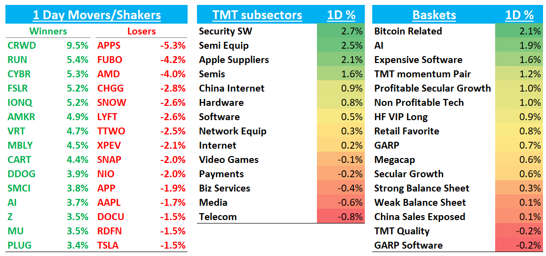 Early one today... QQQs +40bps as the market continues to grind higher. AI-exposed names continue to lead us higher, but got some help from software and large cap internet today (AMZN finally getting close to ATHs…)