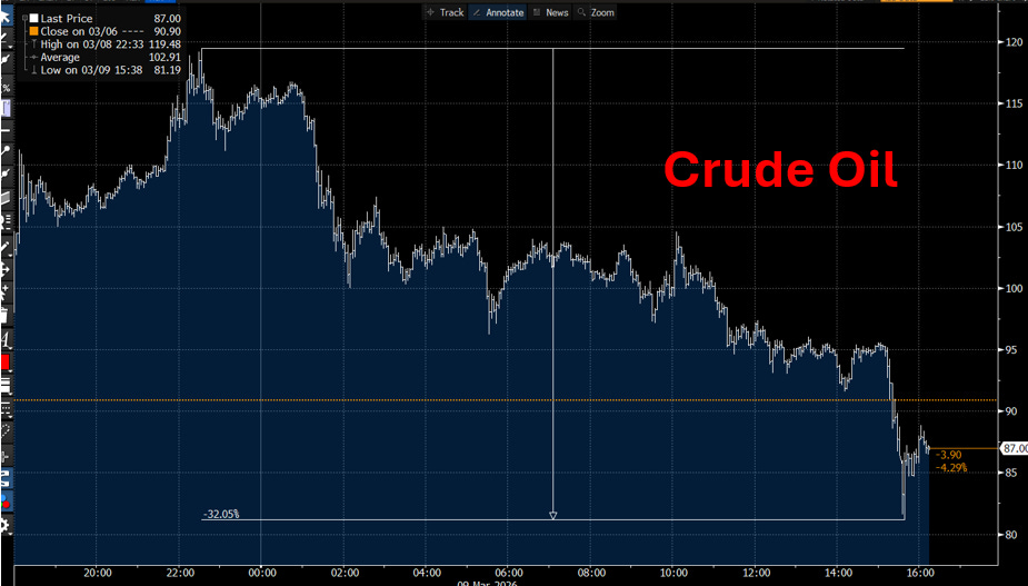 Good afternoon. Can’t say things are boring that’s for sure. QQQs +1.3% rallying from down close to 3% at one point overnight. The first piece of news was G-7 considering to release reserves causing stocks to rally early, then in the late afternoon, CBS news reported that Trump said “the war is very complete” and he’s considering taking over Strait of Hormuz….”If you look, they have nothing left. There's nothing left in a military sense…we’re very far ahead of schedule.” By that time Oil had already sold off to flat and QQQs had rallied back to slightly up so this added fuel to both sides of that trade with Oil actually finished down 4%, just a tiny 30%+ intra-day sell off: