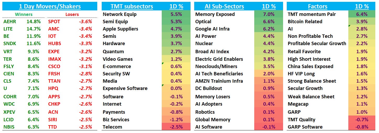 Outside of macro, AI semis caught a strong bid with SOX +4% vs internet/software flat, reversing some of the underperformance last week. AI infrastructure led the tape: Memory Exposed +7%, Optical +6.6%, Google AI Infra +6.2% with a strong bid across AI names and several like LITE, BE, SNDK, VRT up double digits. Software lagged and the perceived “safe havens” like SPOT -3.5% underperformed.
