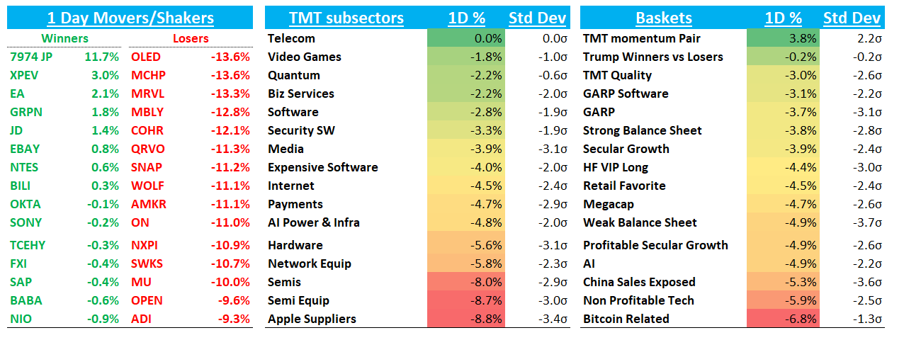 NVDA -6% outperformed other AI semis today. SemiAnalysis’ Dylan Patel said GPU servers are largely exempt given Mexico assembly hub. Joe Moore at MS also had some bullish checks said Blackwell is sold out and demand continues to be “price insensitive” while inference demand at LLMs continues to drive strength. He is also hearing of customers redploying GPUs from Training to Inference along with Hopper demand getting strong again. AMZN also re-iterated capex although Jassy said 'AI does not have to be as expensive as it is today, and it won't be in the future” singling expensive chips and saying “inference will also get meaningfully more efficient in the next couple of years with improvements in model distillation, prompt caching, computing infrastructure, and model architectures.”