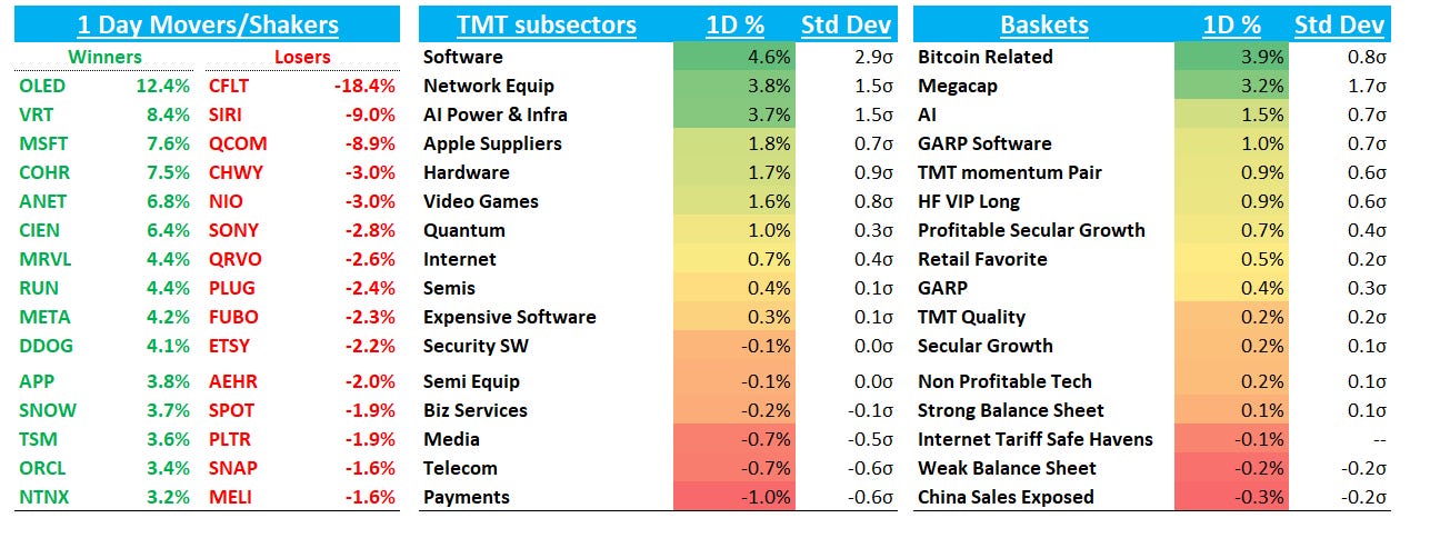 RBLX +3% on a better Q1/Q2 bookings along with a big EBTIDA beat. Mgmt said that strong Q1 trends which reflected the large # of users added in Dec have continued in April, which dovetails with what we have heard from 3rd party data so far. Cowen in their recap note suggested their PCU-based model is suggesting Q2 bookings growth in the 40% y/y range and April engagement data is looking incredibly strong. We found an investors’ quote Jack at JPM passed along to understand the underperformance today: ”: “I hate alt data so much… this is perhaps the most amazing print in TMT and people will just fade it”…Expectations were high and fast money was in the stock. While we pay close attn to 3p data here at TMTB, we try not to game the RBLX quarters and think fast money is missing the transition to a more sustainable 20%+ grower here. We continue to like RBLX’s medium term monetization and secular bull case here: advertising ramp, pricing change driving better bookings growth, increased amount of direct bookings, bringing more content creators to platform, possible Switch 2 integration, AI video game generation driving increased content creation driving flywheel effect, better monetizing in-game / burgeoning partnership with SHOP. 3p continues to point to strong trends so — barring a market pullback — we see no reason why stock shouldn’t be hitting new highs soon along with certain other China/tariff safe haven names.
