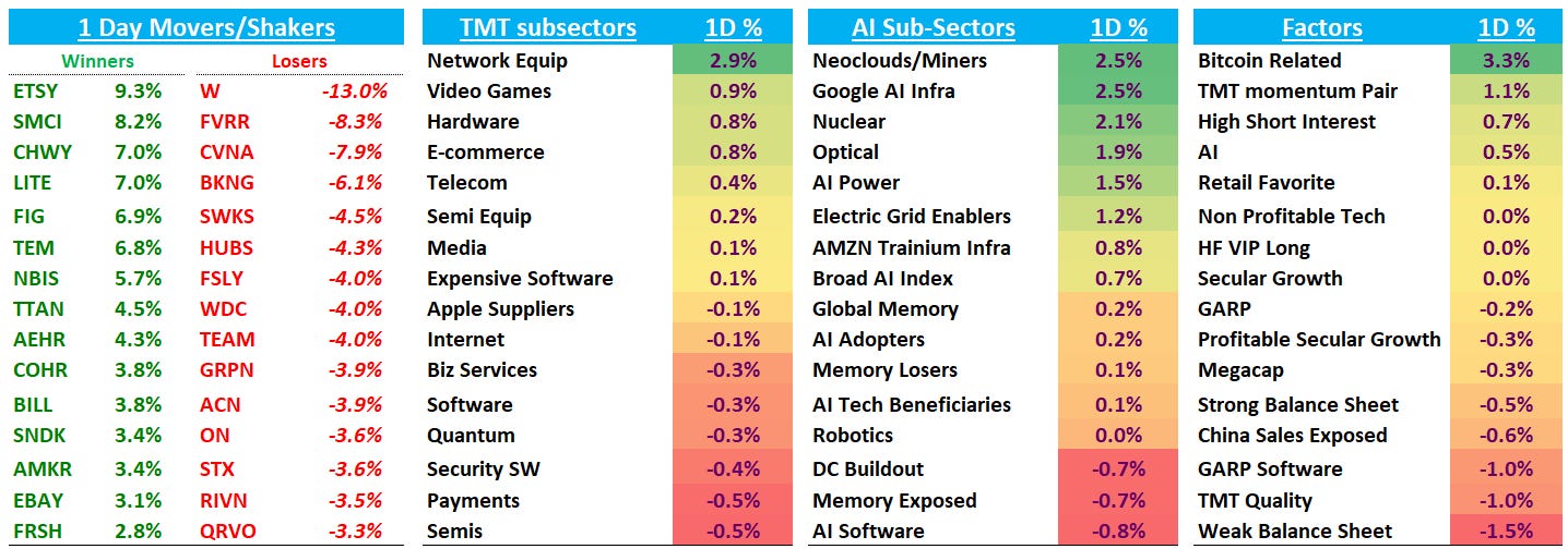 From a sector perspective in Tech, strength concentrated in AI infrastructure and connectivity: Network Equipment (+2.9%), Neoclouds/Miners (+2.5%), and Optical (+1.9%) all leading. Bitcoin-related names and high-beta AI pockets also outperformed, while semis and payments lagged modestly. Factor-wise, momentum and high short interest worked, while quality, megacap, and weak balance sheet cohorts underperformed.