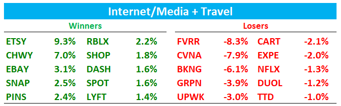 BKNG -6% as print didn’t alleviate bear fears around AI as Q1 EBITDA growth well below street, the headlines #s optically boosted by fx, and FY26 margin expansion framework (+50 bps) is meaningfully below prior consensus (+110–120 bps), and management explicitly tied that to incremental investment. For bears, that means “even with the transformation program, BKNG has to spend more just to keep growth where it is,” which supports a lower multiple in a market already sensitive to the AI narrative. Macro commentary wasn’t great either: lower U.S. ADR/shorter stays.