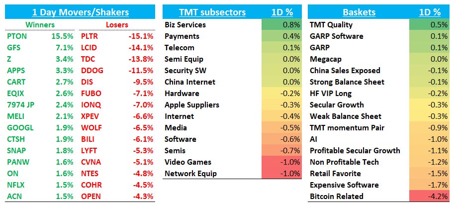 Good afternoon. QQQs finished flat; SOX -75bps; ARKK -2%; IWM +20bps. Quality led the way today as non-profitable tech / AI names underperformed. Yields ticked down 1-3bps across the curve.