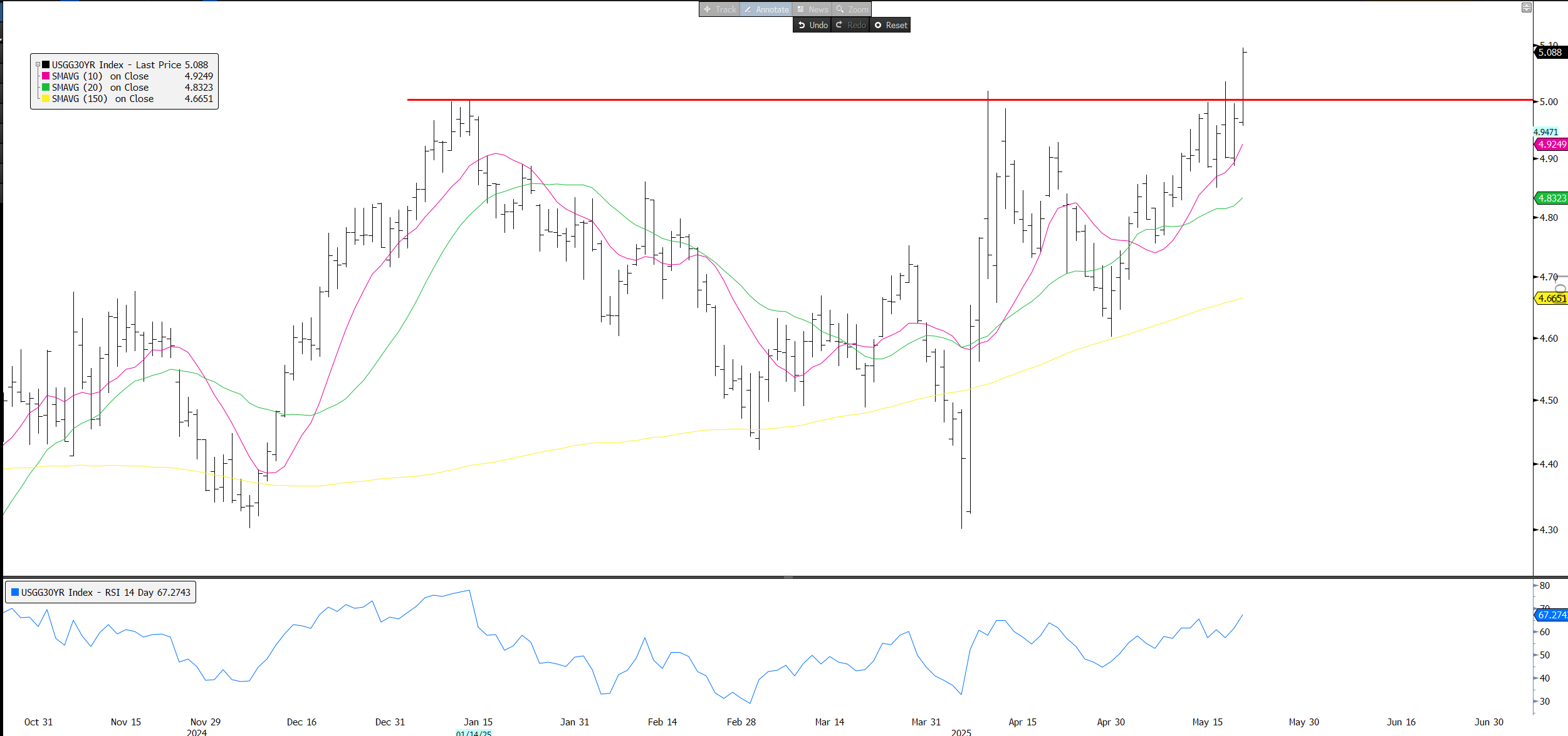 First, lets start with yields as that’s what the market was focused on today. 30 year breaking out to cycle highs: