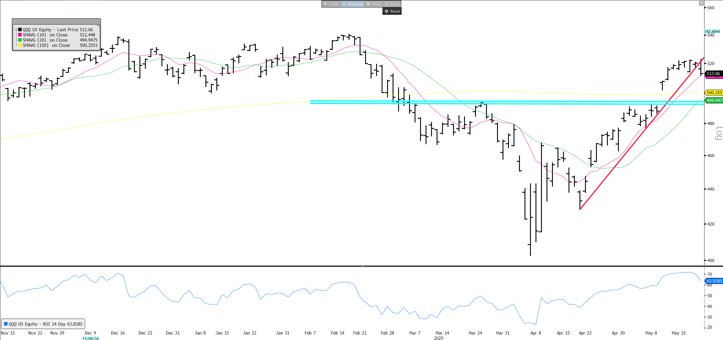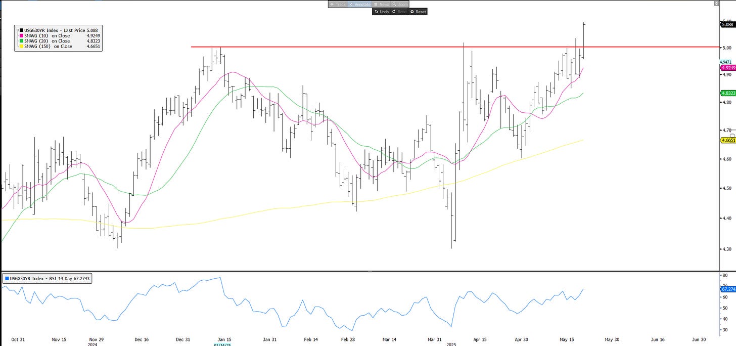 QQQs -1.4% as yields shot higher on a poor 20-year Treasury auction and continued worries about debt/deficit implications of the reconciliation bill. Yields were up 4-10bps across the curve. BTC +1.3% continues to act remarkably well in both risk on and risk off markets.