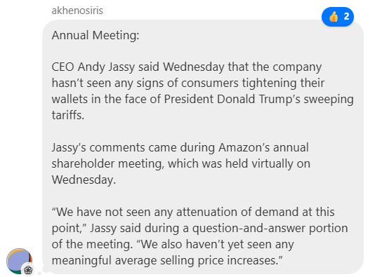 AMZN -1.4% Jassy sounded good at the annual shareholder meeting, with jives with what 3p data has been telling us: Retail tracking 4-5 pps above street. From TMTB Chat: