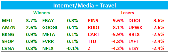 TXN +8% as revs were a touch light for the q, but guiding Q1 to be 2% better q/q (vs expects for flat) and GM 55.9% vs street at 54.9%. Capex a little below expects ($925M vs Street $1.25B) driving FCF upside to $1.33B vs Street $885M.