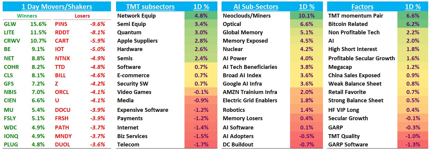 Good afternoon. QQQs +90bps now up 4 days in a row, outperforming IWM by 300+ bps over that stretch and getting close to ATHs. In tech, Optical, networking, and semis outperformed, with strength across hyperscaler-exposed names and global memory (+5%+). Neoclouds/miners and AI power were standout AI sub-themes helped by CRWV’s DB upgrade. In contrast, the Great Software Bull Market of 2026 was over after 3 days with plenty of app sw names down. Factor wise, momentum factors broke out to the upside today with GS TMT Mo pair breaking out to ATHs. Front end of the curve dipped while the long end rose 2-4bps. Fed expects held steady.