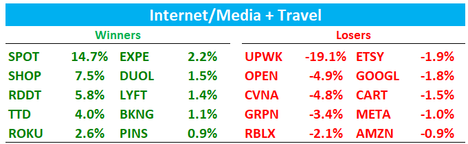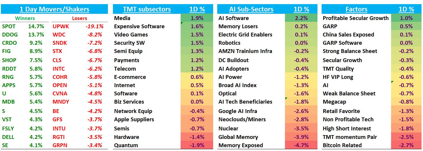 SPOT +15% as the Q1 GM guide stole the show helping alleviate some bear fears that GMs have peaked. Mgmt reiterated price increases should outpace net content cost growth in 2026, which addresses investor concerns that label economics/wholesale moves would cap margin expansion. Stock had been used as a funding short and short interest was near highs so this print goes a good way to helping bulls get back in the saddle where they can get back to talking about the LT drivers: still growing users at scale, proving durable pricing power, and structurally expanding margins as it layers higher-margin revenue streams (Marketplace, improving Ads, audiobooks/podcasts/video) on top of a massive music subscription base. On AI, mgmt pushed back on fears with the argument that Spotify is the scaled distributor where the “cultural moment” happens, and AI is more likely to increase content supply and interactivity (raising engagement/retention) than disintermediate Spotify. Bears nitpicked on the Q1 rev guide below street and fact ad revs declined y/y despite fx tailwinds and that Q4 op inc included sizable social charge benefit while mgmt hedged on linearity of margin improvement saying margin progression variable depending on reinvestment timing.