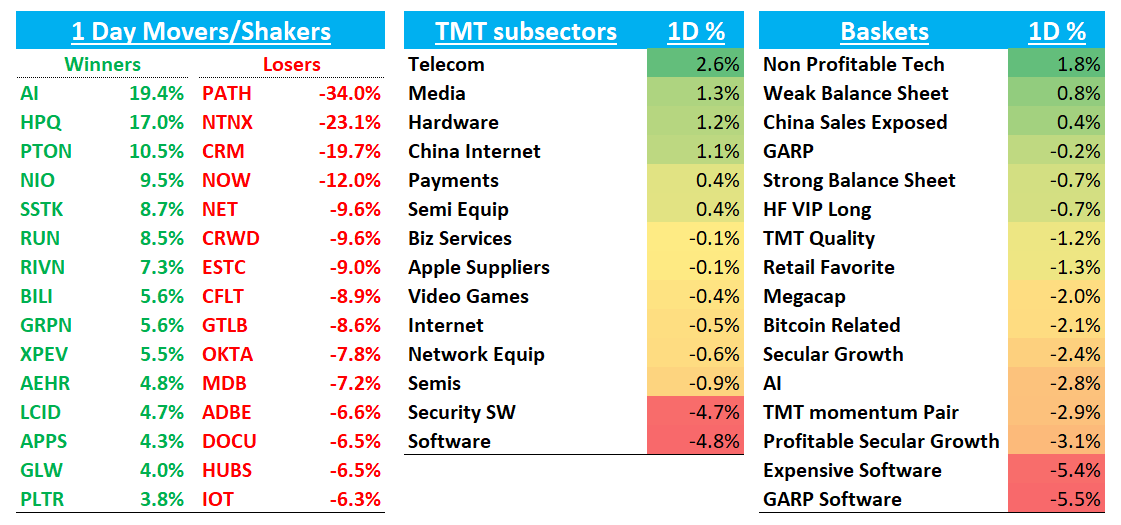 Well, what a day…QQQs -1% although the price action underneath showed a much more telling story…Not a great day to be a sw investor - things were already bad and they took another step function lower last night post CRM and PATH debacles. Lots of de-grossing action across software books today NOW -12% is notable. That de-grossing seeped into other sectors as well such as internet (consensus longs META/AMZN/NFLX -1%+) and semis (NVDA /AVGO/MU all underperforming heavily). Really one of the more sharp de-grossing days across the board in Tech in a while. IGV -5%, one of the worst days of the last 5 years outside of Covid.