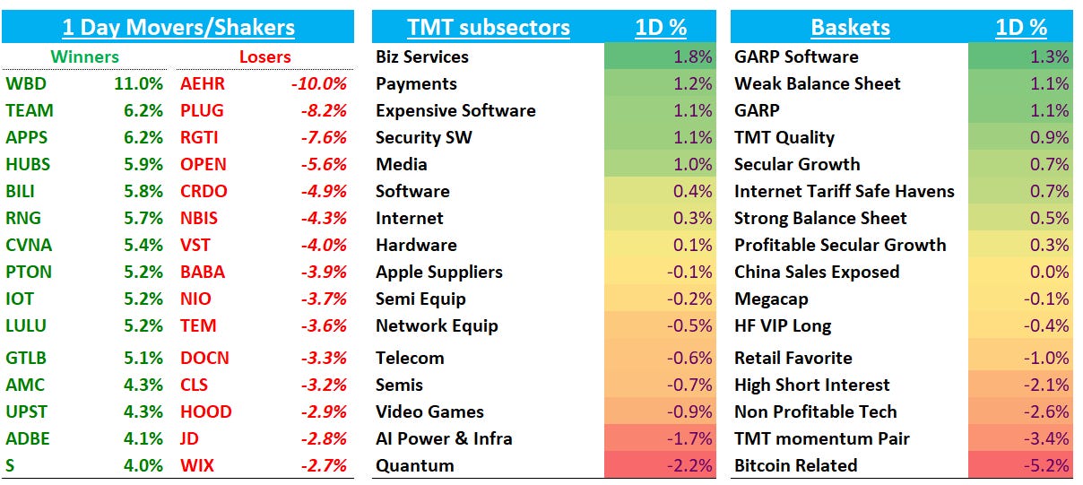Good afternoon. QQQs flattish as the game of factor see-saw continues. GARP software led us up a the expense of AI linked names. Both non-profitable Tech and TMT mo were down, while areas of momentum/spec (gold, crypto, quantum) sold off. Hearing a lot of continued frustration among the L/S crowd in Oct.