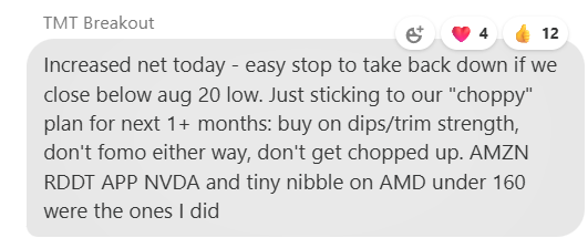“Choppy” that eventually resolves up is our base case. We thought today was a good risk/reward spot to increase our net a bit more than normal — it’s very possible this could have been the low for the year and if so we are positioned accordingly now. If we’re wrong, then easy to trim our net back down if we break below the Aug 20th low. We’ll continue to adjust accordingly.