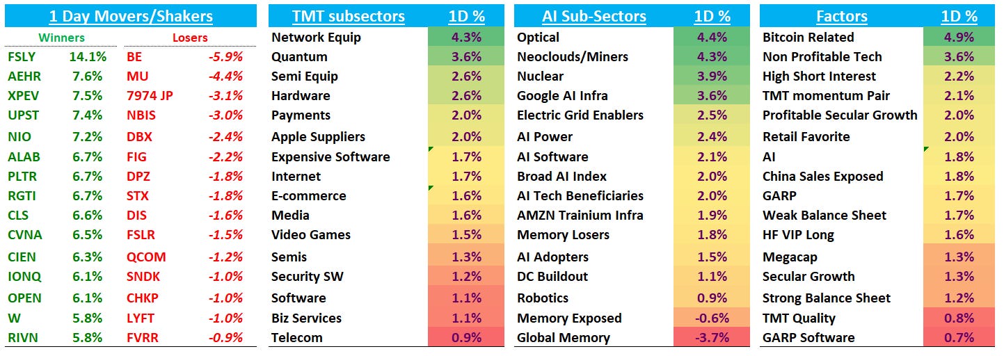 In Tech, fairly broad breadth with all sectors up. AI complex held up fairly well with led by optical/neoclouds while memory lagged (more on this below when we get into AI semis). From a factor perspective, non profitable tech and high short interest led the way although TMT Momentum not far behind.