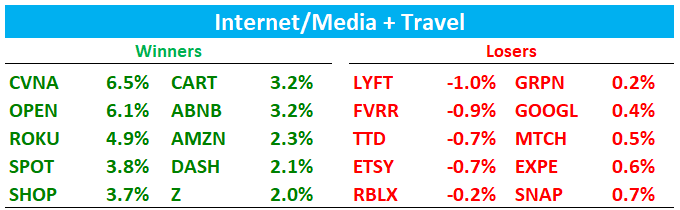 ROKU +5% the big winner: checks here continue to sound strong intra q after platform revs accelerated this quarter. Bull case here centers around continued platform accel/conservative guide and narrative is 3-pronged: 1) the secular shift of TV ad budgets from linear to CTV, 2) Roku’s role as an interoperable platform that can work across major demand sources (rather than being constrained to a single walled garden), and 3) rising monetization efficiency from better measurement, performance tooling, and expanded inventory/product surfaces (e.g., home screen innovation).