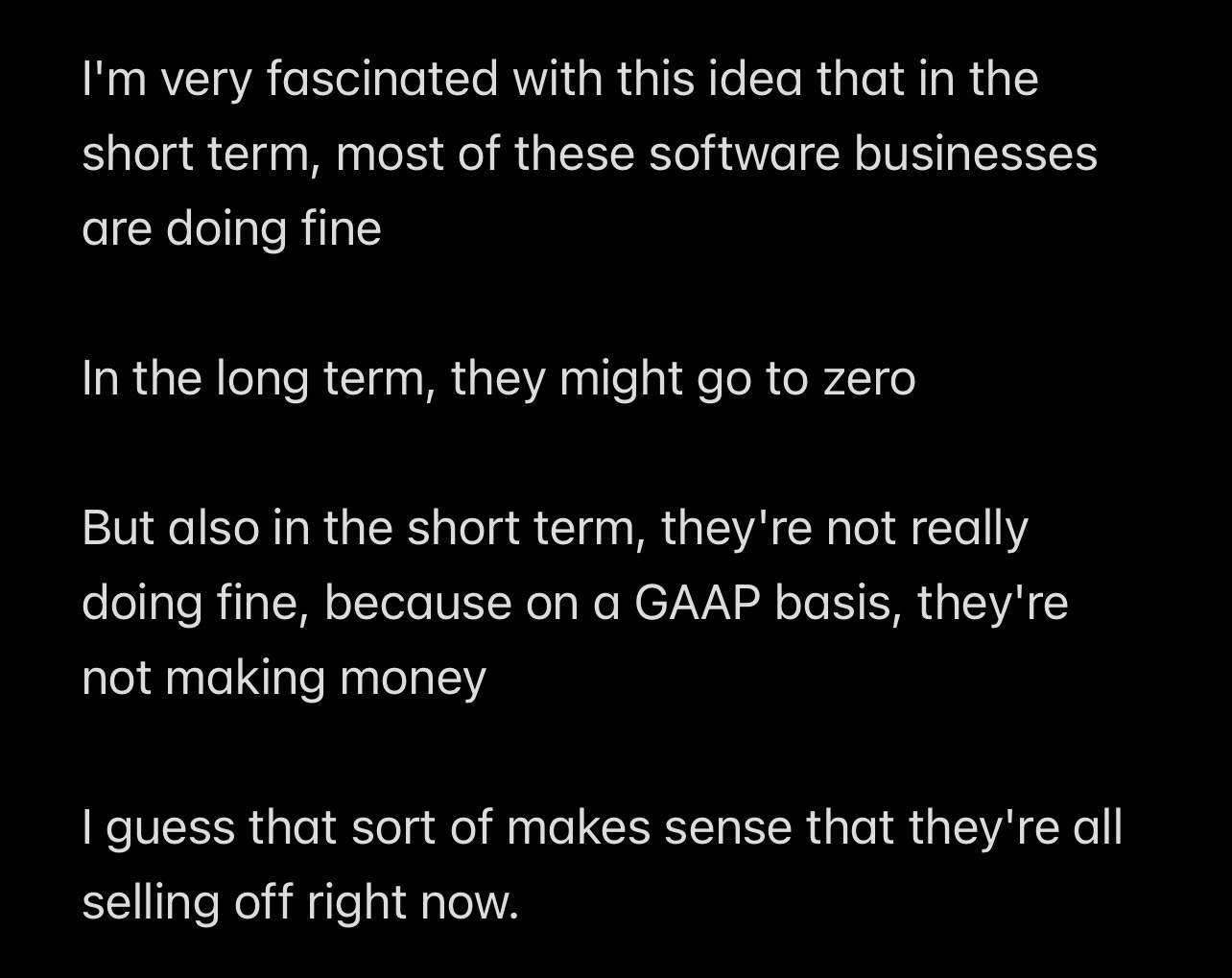 Citrini’s piece tapped directly into the darker frequency that people are attracted to and served as the perfect catalyst for these fears. In this day and age, investors (and humans) tend to forget they can dream much better outcomes. Tech investors have been having similar conversations for a few weeks now, but when it comes from a high signal substack writer with a very large following who is also great at capturing the current zeitgeist, then you get a day like today. (Btw - we thought it was a very interesting piece - kudos to Citrini for writing it).