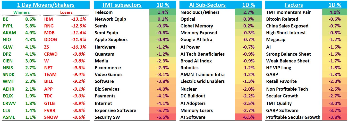 Good afternoon. QQQs -1.22% on the “Citrini sell-off” hitting most of internet and software while semis outperformed again. Nothing new in Tech land that investors haven’t already been dealing with in 2026. But the Citrini article bought even more visibility to what’s already been happening in these circles.