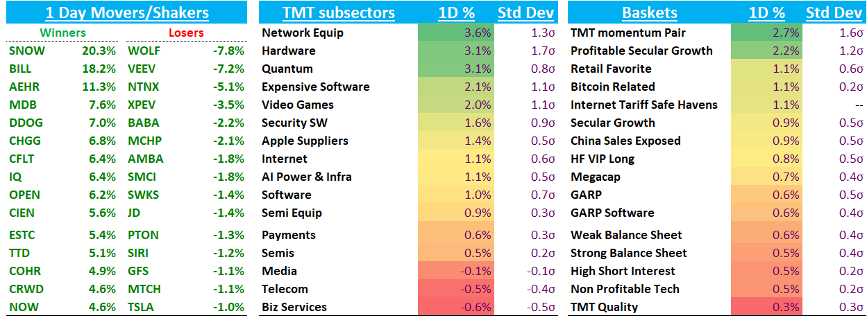 However, we don’t think it’s all clear for names facing secular/competitive issues — that was evidenced in more mixed price action for that bucket, including some app sw names: SAP +11bps; NOW +4%; CRM +2%; WDAY -50bps; INTU +75bps; ADBE -70bps; ACN -40bps; CTSH -80bps.