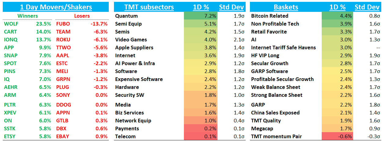 RBLX +5.8% following through yesterday, helped by news TTWO was delaying GTA VI’s release from the fall until May ‘26. We wrote up some thoughts in our EOD wrap yesterday…Also helped by the Epic court ruling….so is SPOT +7.5% (from my understanding no EPS benefit but process of upgrading more friction free…pls let me know if I’m wrong) and NFLX +1.7%, which is up 11 straight days now (META was 20 straight days earlier this year as it called the mkt top - so when we get to 21 we know we’re close)