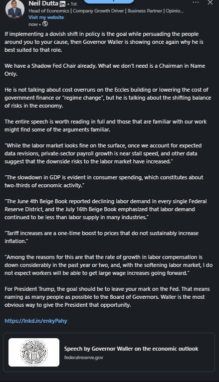 Early one today. QQQs hovering around flat on a slow summer Friday. Treasuries are up slightly with yields flat to down 3-4 bps. Fed expects continue to price in 45bps wroth of cuts this year as Waller had a dovish speech yesterday calling for a July rate cut. More details on that: