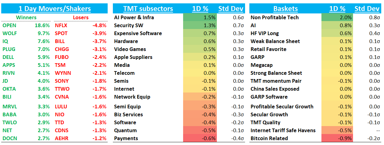 NFLX -4.5% as investors digested the print, which was fairly inline. Bears picked at the low engagement numbers and lack of upside valuation at current px: 35x $35 = $1,225…SPOT -3% in sympathy