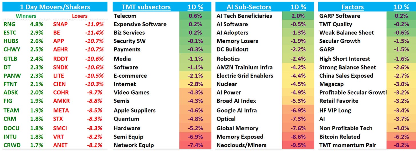 The environment continues to be a frustrating one for tech investors, who continue to run low gross waiting for the Iran turbulence to settle. In the meantime, the factor and sector whiplash continues - today it was semis underperforming software by 300bps+ and TMT Mo having one of its worst days in years (-8%) as favored sectors in semis — optical, seimcap, memory — all down close to double digits.