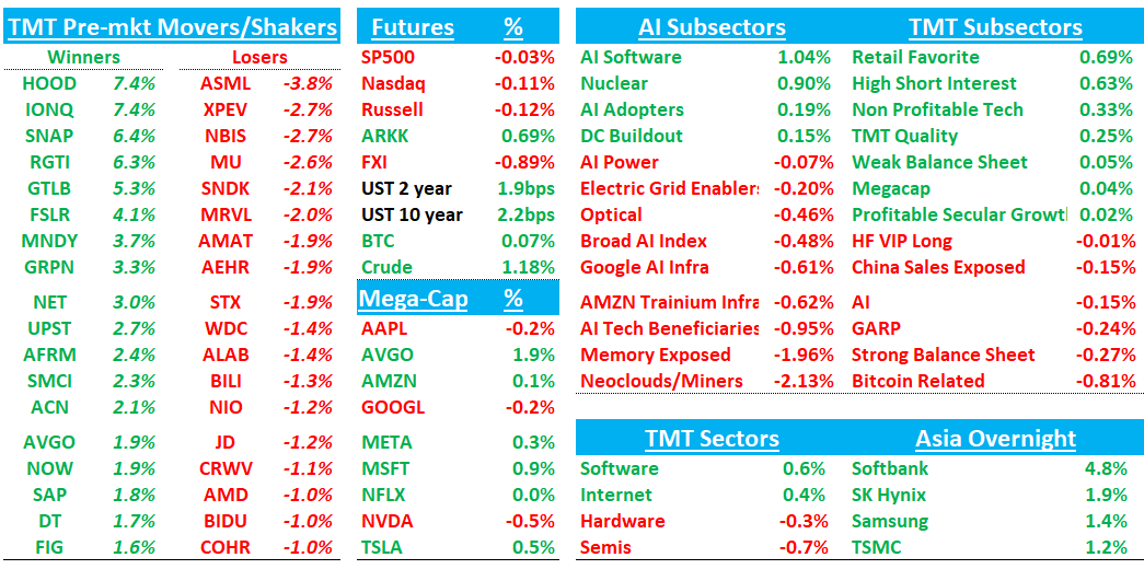 Asia mainly green overnight: TPX +0.4%, NKY +0.44%, Hang Seng +0.29%, HSCEI +0.54%, SHCOMP +0.01%, Shenzhen -0.71%, Taiwan TAIEX +1.17%, Korea KOSPI +2.07%. Softbank +5%; Kioxia -7% on the Chinese supply news yesterday. Memory in the US lower as well with MU/SNDK/HDDs -2%. Software higher (+60bps) vs Semis (-70bps) early.