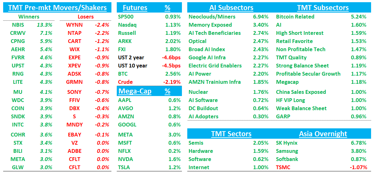 Good morning. Futures +1% have a bid this morning in large part on talks of an int’l coalition of ships being formed to reopen Hormuz, although much of the details remain unclear and it’s not certain any escorts would start until fighting ends. BTC +2.5%. Asia mixed although memory names ripped in Korea: TPX -0.5%, NKY -0.13%, Hang Seng +1.45%, HSCEI +1.67%, SHCOMP -0.26%, Shenzhen +0.16%, Taiwan TAIEX -0.17%, Korea KOSPI +1.14%. PHISON+10%, NANYA+10%, KOIXIA+7.5%, HYNIX+6%, SAMSUNG+2.5%
