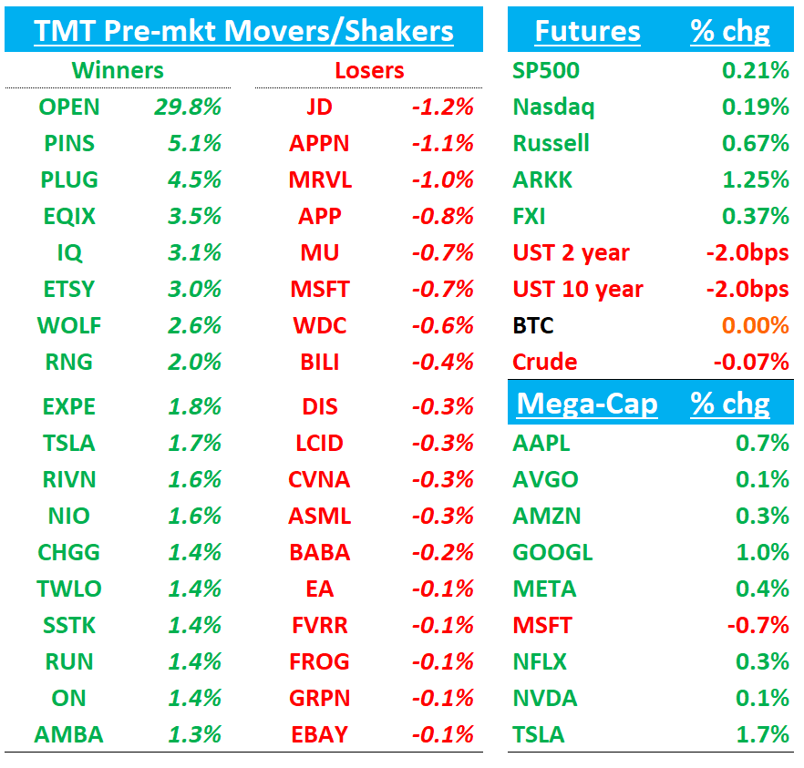 Good morning. QQQs +20bps while yields tick lower (10 year down 5 bps) ahead of a busy week of earnings as 20%+ of SP500 reports and 70% of TMT will report over the next two weeks with TSLA GOOG and NOW the highlights this week. GS notes “the average tech stock is implying an earnings day move of 4.7%, the lowest level in two decades (it hasn’t been this cheap to hedge tech earnings in 20 years).”
