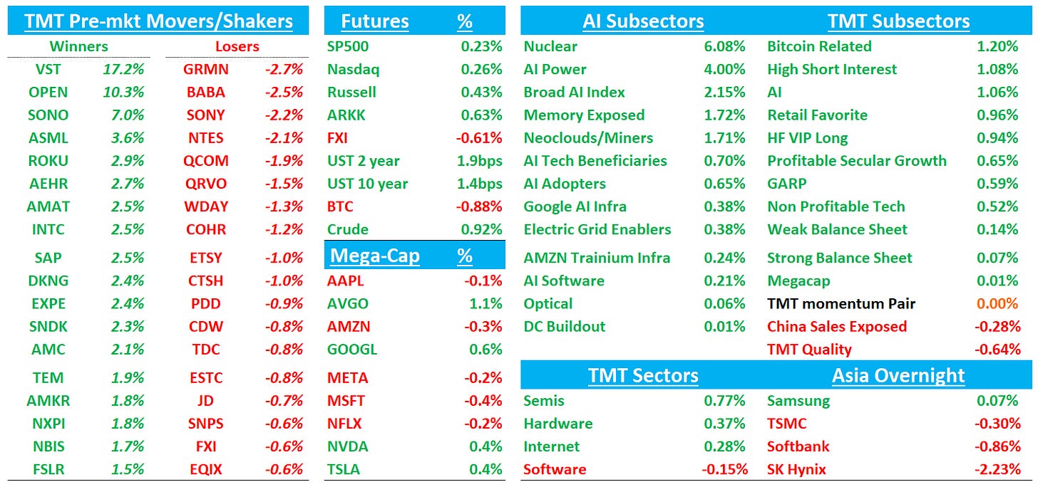 QQQs +25bps ahead of NFP in a few minutes and a potential Tariff ruling around 10am. Asia stocks up overnight: TPX +0.85%, NKY +1.61%, Hang Seng +0.32%, HSCEI +0.1%, SHCOMP +0.92%, Shenzhen +1.34%, Taiwan TAIEX -0.24%, Korea KOSPI +0.75%.