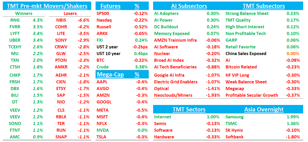 We get some investor days at OFC today with LITE 1pm est, COHR 4pm, FN 6pm, & AAOI 7pm. Optical names lower to start (LITE -4%; COHR -4%; CIEN -2%) following through on some sell the news actoin post NVDA conference (see our quotes from Jensen in EOD Wrap)