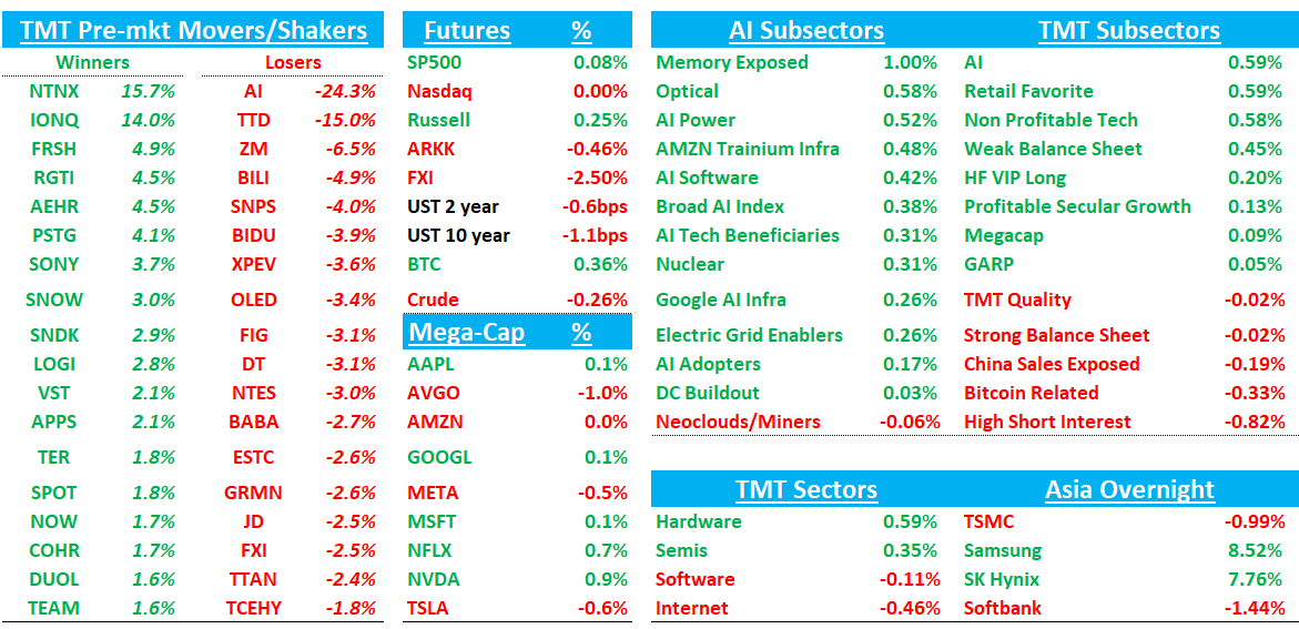 Good morning. Futures flat early. BTC -1.4%. Asia saw mixed price action overnight with Korea that standout as it continues to rip: TPX +0.97%, NKY +0.29%, Hang Seng -1.44%, HSCEI -2.44%, SHCOMP -0.01%, Shenzhen +0.33%, Taiwan TAIEX flat, Korea KOSPI +3.67%. Memory names ripped: Samsung +8% (MS note yesterday); Hynix +8% (SNDK HBF partnership).