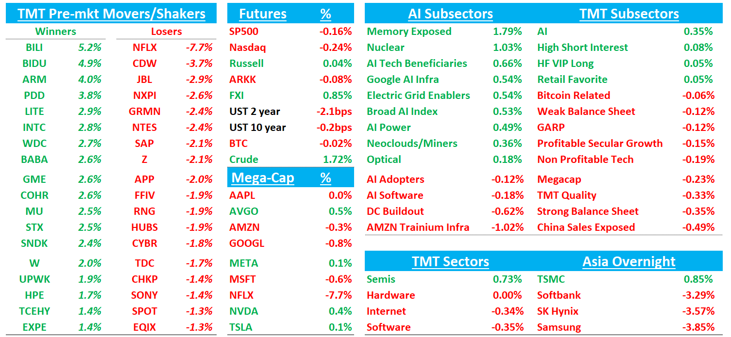 Good morning. Futures -30bp with yields flattish. 10 year yields in Japan are down 7bps. Asia mixed overnight: Asia saw mixed price action TPX -0.99%, NKY -0.41%, Hang Seng +0.37%, HSCEI +0.31%, SHCOMP +0.08%, Shenzhen +0.64%, Taiwan TAIEX -1.62%, Korea KOSPI +0.49%. Memory bifurcated with KIOXIA+8.5% (NAND), SAMSUNG+5%, HYNIX+1.8% vs Phison-5%, Nanya-7.7% (DRAM). BTC flattish.