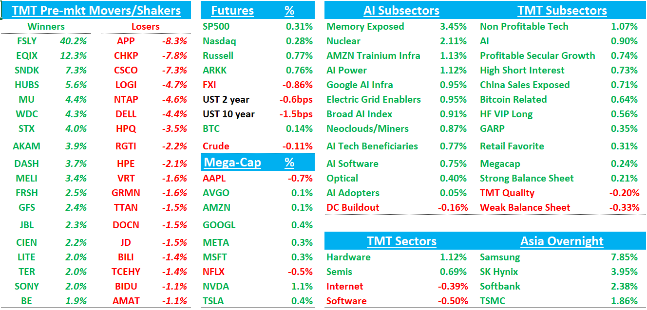 Good morning. QQQs +23bps. Asia mixed although memory names up with Samsung +8%, Kioxia +10%, etc: TPX +0.7%, NKY -0.02%, Hang Seng -0.86%, HSCEI -1%, SHCOMP +0.05%, Shenzhen +0.51%, Korea KOSPI +3.13%. BTC flat. Yields slightly down.