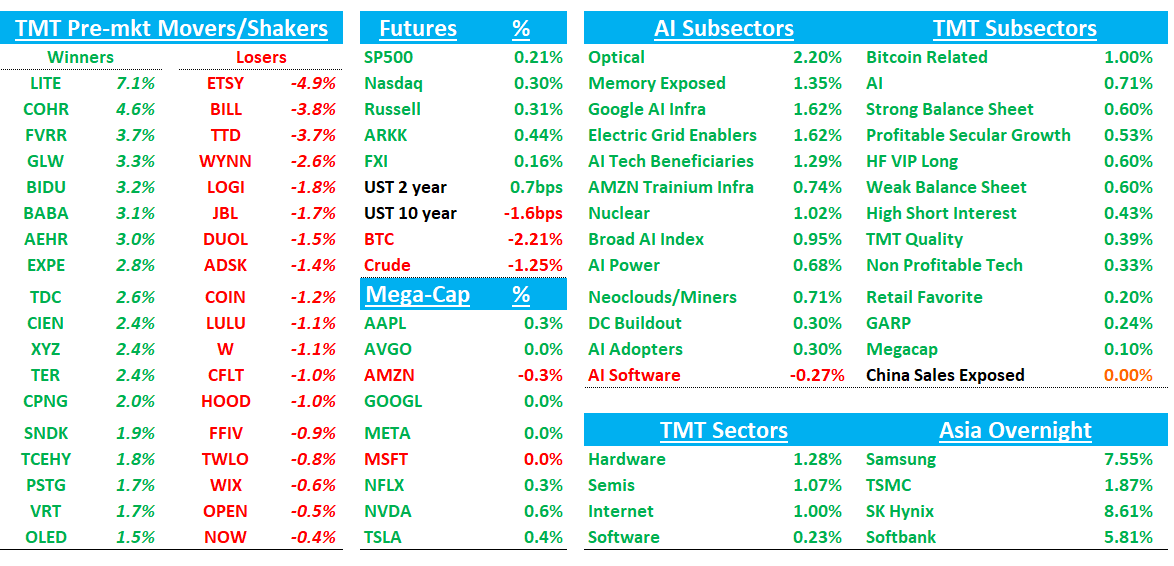 Good morning. Futures +25bps. No big war news overnight other than news Iraq beginning to route some oil to Turkey via pipeline. Asia up overnight with Korea the standout with memory names strong (Samsung/SK Hynix +8%): TPX +2.49%, NKY +2.87%, Hang Seng +0.61%, HSCEI +0.1%, SHCOMP +0.32%, Shenzhen +0.97%, Taiwan TAIEX +1.51%, Korea KOSPI +5.04%,