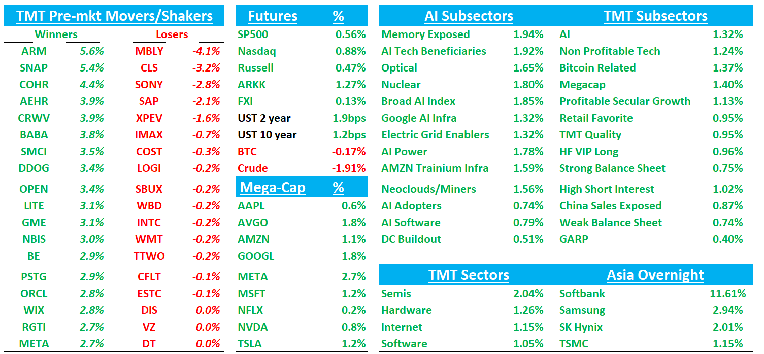 Good morning. Futures +80bps as rally continues after yesterday’s Taco. Asia up across the board: TPX +0.74%, NKY +1.73%, Hang Seng +0.17%, HSCEI -0.09%, SHCOMP +0.14%, Shenzhen +0.69%, Taiwan TAIEX +1.6%, Korea KOSPI +0.87%. Softbank +12%. UBIsoft-30% in Europe. Yields flattish. BTC hovering around $90k. Mag 5 outperforming early - do we finally get some flows back into large cap internet/TSLA today?