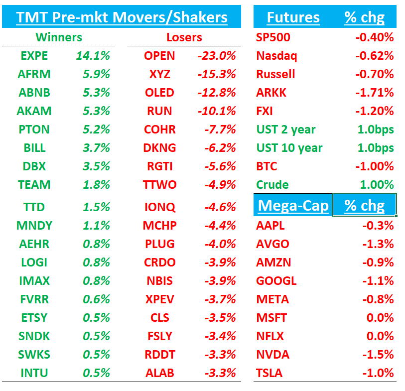 EXPE +14%: Clean beat & raise, beating bogeys/street — nights +11% y/y (fastest growth in >3 years), revenue +9% y/y, EBITDA margin +~200 bps y/y; FY guide raised with Q4 outlook calling for 6–8% growth and continued margin expansion.