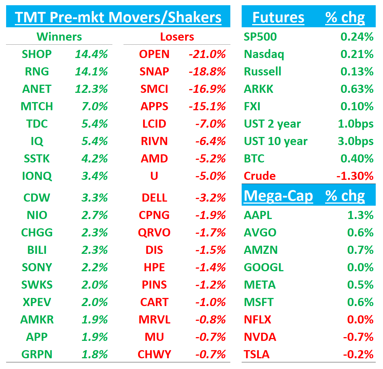 We’ll hit SHOP (wow!), UBER, U, DIS first this morning, then recap AMD, ANET, ALAB, SNAP, SMCI and more from last night below….