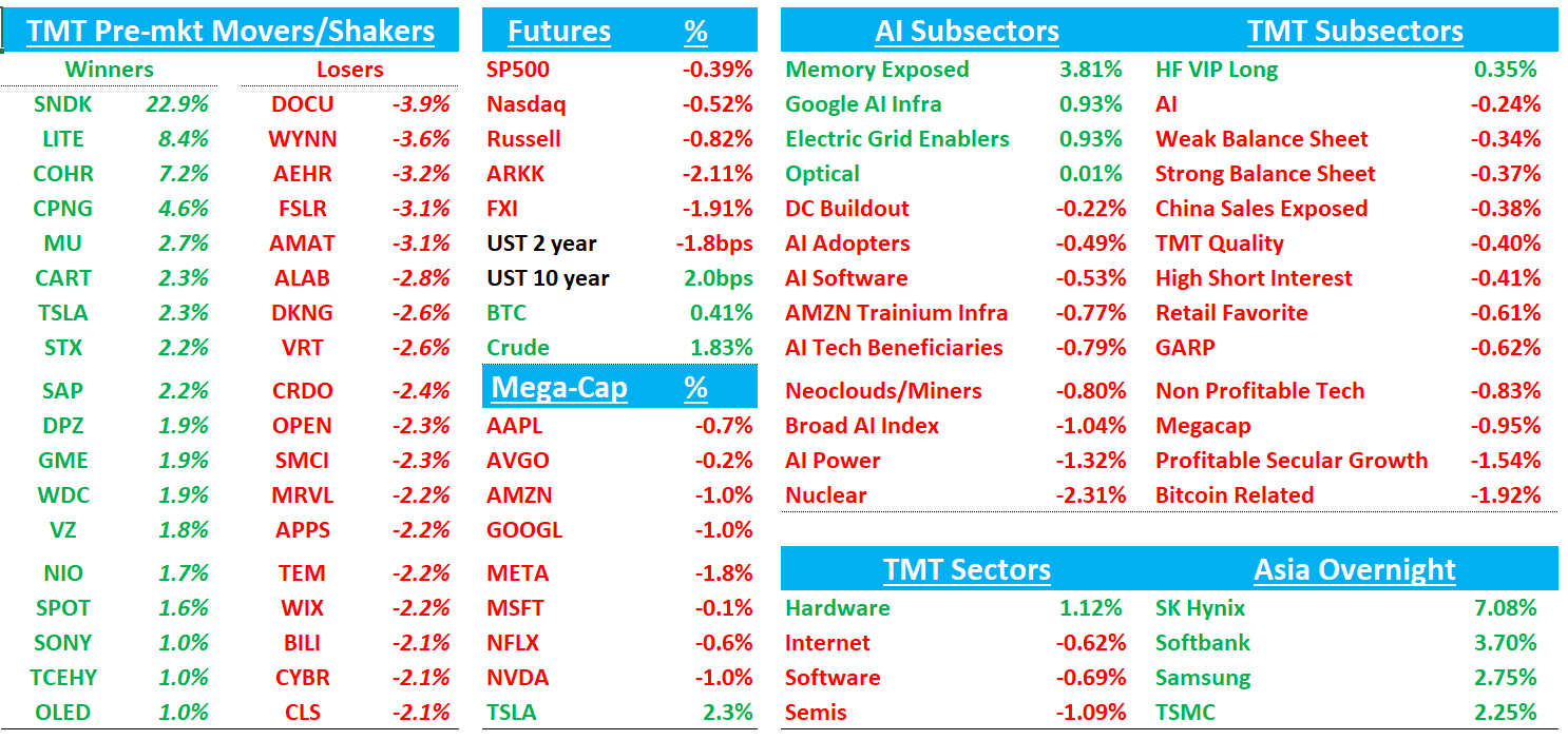 SNDK +21%: Absolutely crushed the March Q guide at $12-14 vs street at $5 and bogeys of $9. Buyside numbers going up to $100+ for CY27. Call extremely bullish and demand forecast doesn’t contemplate any incremental demand from KV Cache offload.