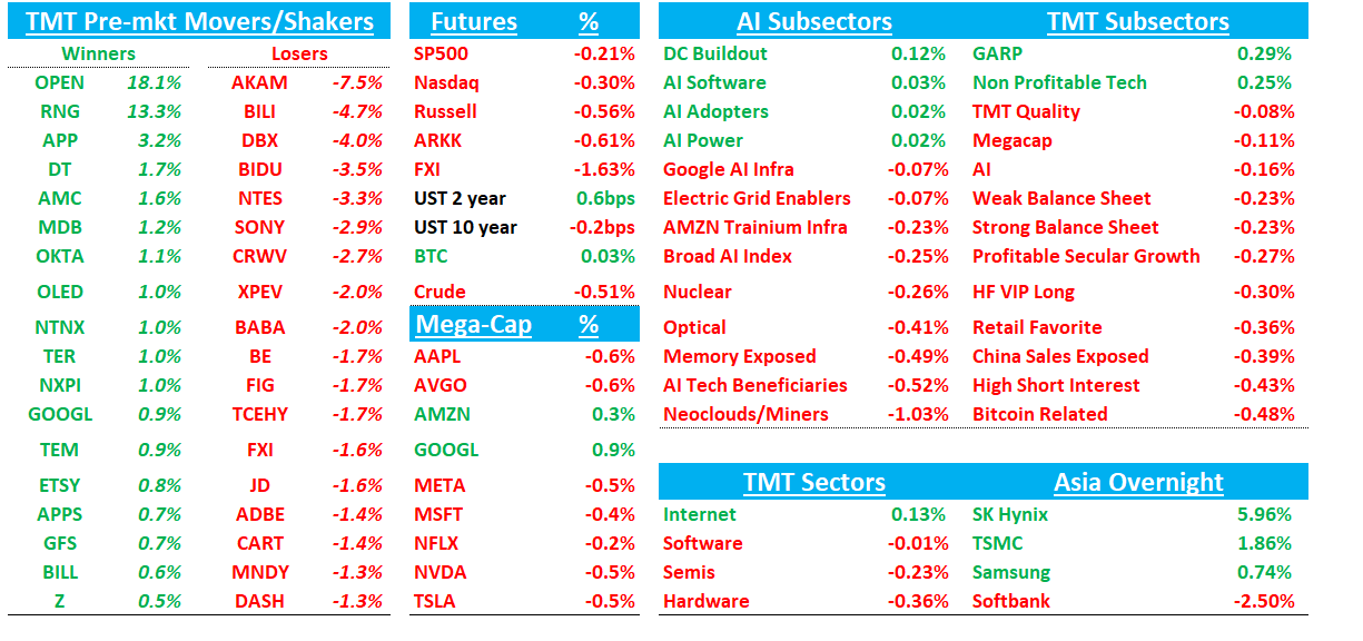 Futures -25bps after some slightly hotted PCE data. Asia saw mixed price action on Friday: TPX -1.13%, NKY -1.12%, Hang Seng -1.1%, HSCEI -1.22%, Korea KOSPI +2.31%. Memory names were up with Hynix +6% and hitting new highs. Yields are flattish ahead of potential SCOTUS decision on IEEPA tariffs. BTC +50bps