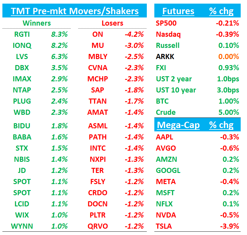 STM −9.5%: Q4 guide light, recovery slower. Q3 beat at $3.19B/$0.29 vs $3.17B/$0.22, but Q4 rev guided to $3.28B (±350 bps) vs $3.35B and GM to 35% (±350 bps) vs 34.6%. Management cited normal seasonality (lower auto capacity-reservation fees) and continued industrial inventory digestion. GM lift comes from better manufacturing efficiency; inventories seen stable near term with a seasonal uptick in 1H’26. Industrial demand solid in power/energy and robotics; consumer remains soft; MCU inventories normalized.
