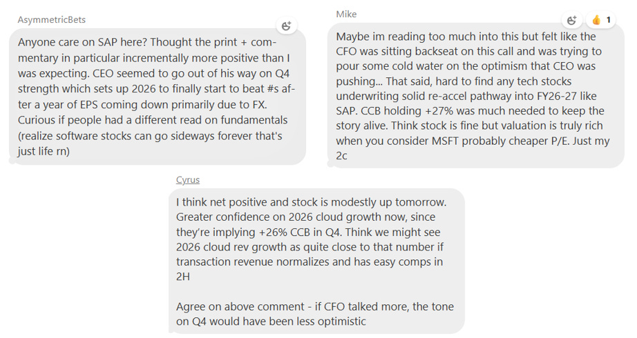 Bears focus on decelerating CCB vs 2024 peaks and the FY25 cloud guide to the low end, fearing a tougher macro/industrial and public sector backdrop, FX headwinds into Q4, and persistent transactional softness (Concur) that keeps reported growth and visibility constrained. They also flag regulatory noise (EU maintenance probe) and competitive noise (Oracle’s ERP momentum, OCI adjacency) as potential overhangs until CCB growth stabilizes and we see Q4 signings upside delivered.