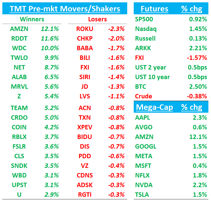 AMZN +13%: Hello acceleration my old friend! AWS re‑accelerates to +20% y/y, rev beat across the board, ex‑items operating income beat the Street, and Q4 guidance bracketed consensus—fueling the “AWS unlock” narrative. Jassy delivers a 180 in tone on the call.